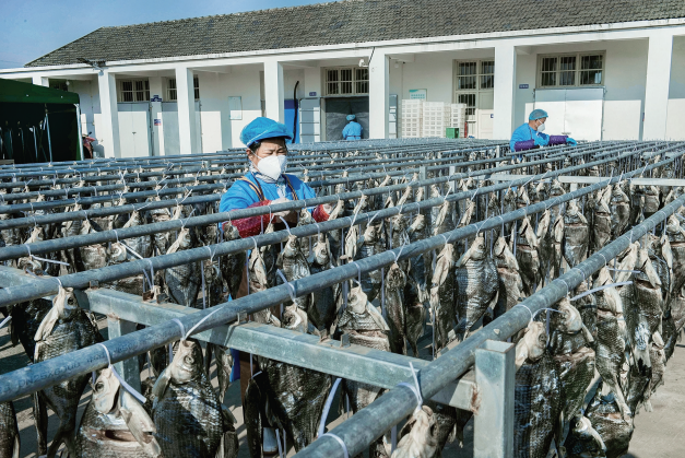 图为日前,在含山县安徽吴楚生物科技有限公司,工人在晾晒封扁鱼。