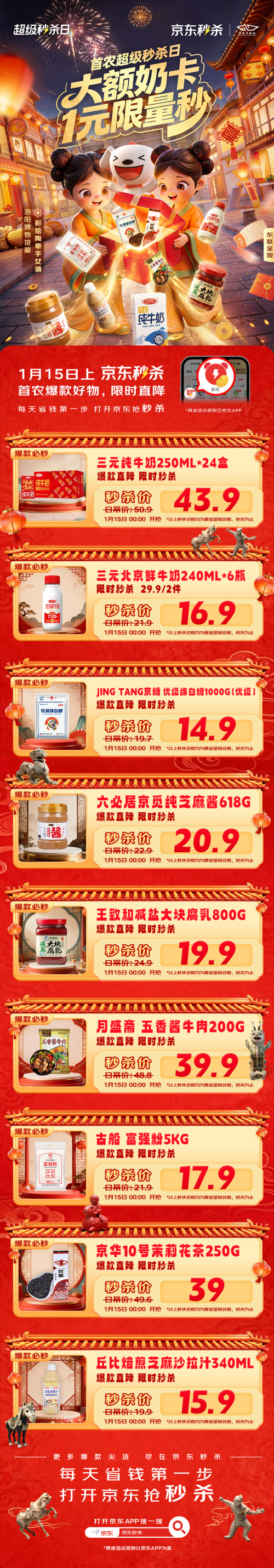 1月15日10点、20点两个时段,消费者打开京东APP进入秒杀频道,在“每日必秒”活动界面即可参与价值300元的大额三元品牌奶卡1元秒杀活动。当天上午10点,首农还将携旗下三元、大红门、月盛斋、六必居等老字号店铺在京东直播间同步开播,消费者可通过直播间深入了解各品牌的产品特色与品质保障,与主播实时互动,抢购专属优惠,为新春佳节备足满满年味。