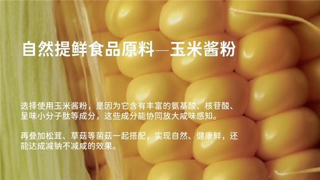 而松鲜鲜首创的松茸调味料,则创新性地将玉米发酵物(玉米酱粉)与松茸、菌菇、酵母抽提物等多种自然鲜味物质相结合,在不添加人工增味剂、防腐剂的前提下,利用其自然发酵产生的咸味与鲜味,代替盐+味精/鸡精使用。在保证调味不失鲜咸的同时,有效控制总钠的添加量,为消费者提供健康减钠的产品解决方案。