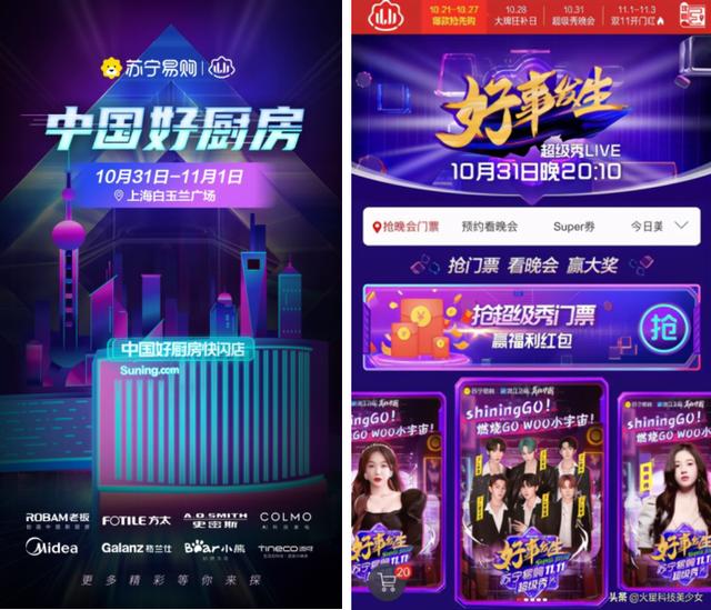 在双十一的势头上,苏宁易购当仁不让,10月31日-11月1日,中国好厨房双线活动,打响2020年双十一开门红!10月31日,同步开启苏宁易购浙江卫视双十一超级秀以及苏宁易购《英雄联盟》S10总决赛,均为全民关注热潮。11月1日零点开启多重福利,百亿补贴、买厨卫抽戴森、抢免单、抢五折、24期免息、J-10%、贵就赔等多种方式让消费者买的更放心;服务上,厨卫产品30天包退、急速送货、无忧安装、以旧换新;小家电产品30天包退,365天只换不修、下单次日达、取件上门、极速退款、无忧退换等服务为用户提供更高性价比的"好商品"以及"好服务"。